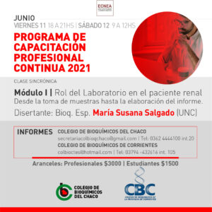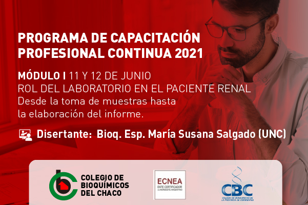 Se encuentra abierta la inscripción para participar del Módulo 1 de nuestro Programa de Capacitación Profesional Continua 2021. El tema central en esta oportunidad será el “Rol del Laboratorio en el paciente renal” y estará a cargo la Bioq. Esp. María Susana Salgado.