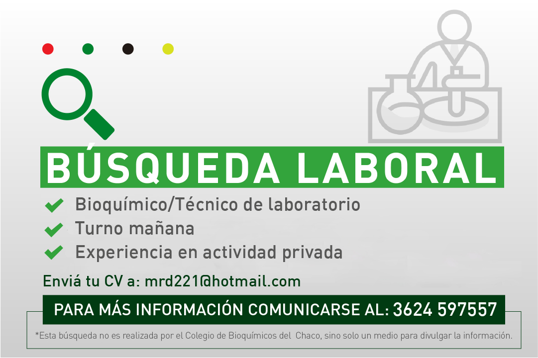 Les informamos a nuestros profesionales que se encuentra abierta una nueva búsqueda laboral para un bioquímico/a o ténico/a de laboratorio. La bacante es para el turno mañana y preferentemente el postulado debe tener experiencia en la actividad privada