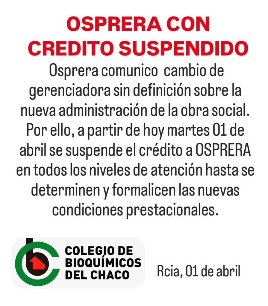 El Colegio de Bioquímicos del Chaco informa que, debido a un cambio en la gerenciadora sin definición sobre la nueva administración de la obra social OSPRERA, se ha decidido suspender el crédito en todos los niveles de atención a partir del martes 1 de abril.
