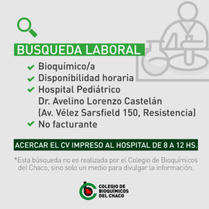 Se encuentra abierta una nueva búsqueda laboral de profesional bioquímico/a para el Hospital Pediátrico Dr. Avelino Lorenzo Castelán, ubicado en Av. Vélez Sarsfield 150, Resistencia.