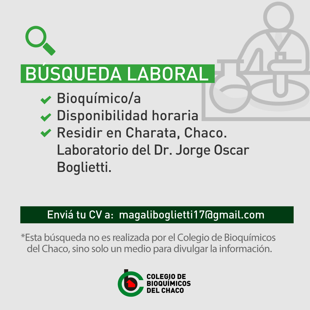 Atención profesionales, les informamos que encuentra abierta una nueva búsqueda laboral para el Laboratorio del Dr. Jorge Oscar Boglietti. Los profesionales bioquímico/a deberán residir en la ciudad de Charata, Chaco.