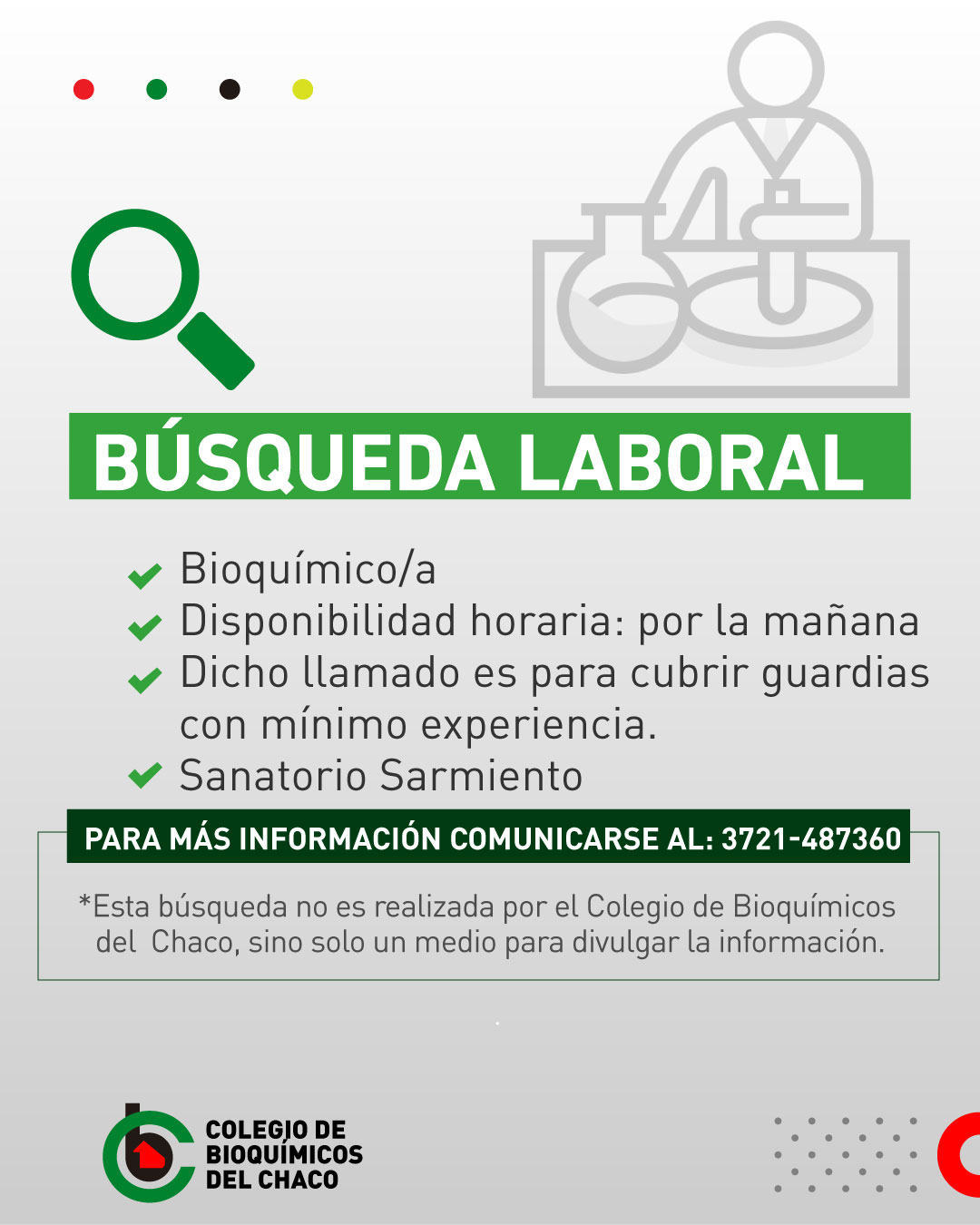 Atención profesionales, les informamos que encuentra abierta una nueva búsqueda laboral para el Sanatorio Sarmiento. Los profesionales bioquímico/a deberán contar con mínima experiencia bioquímica.