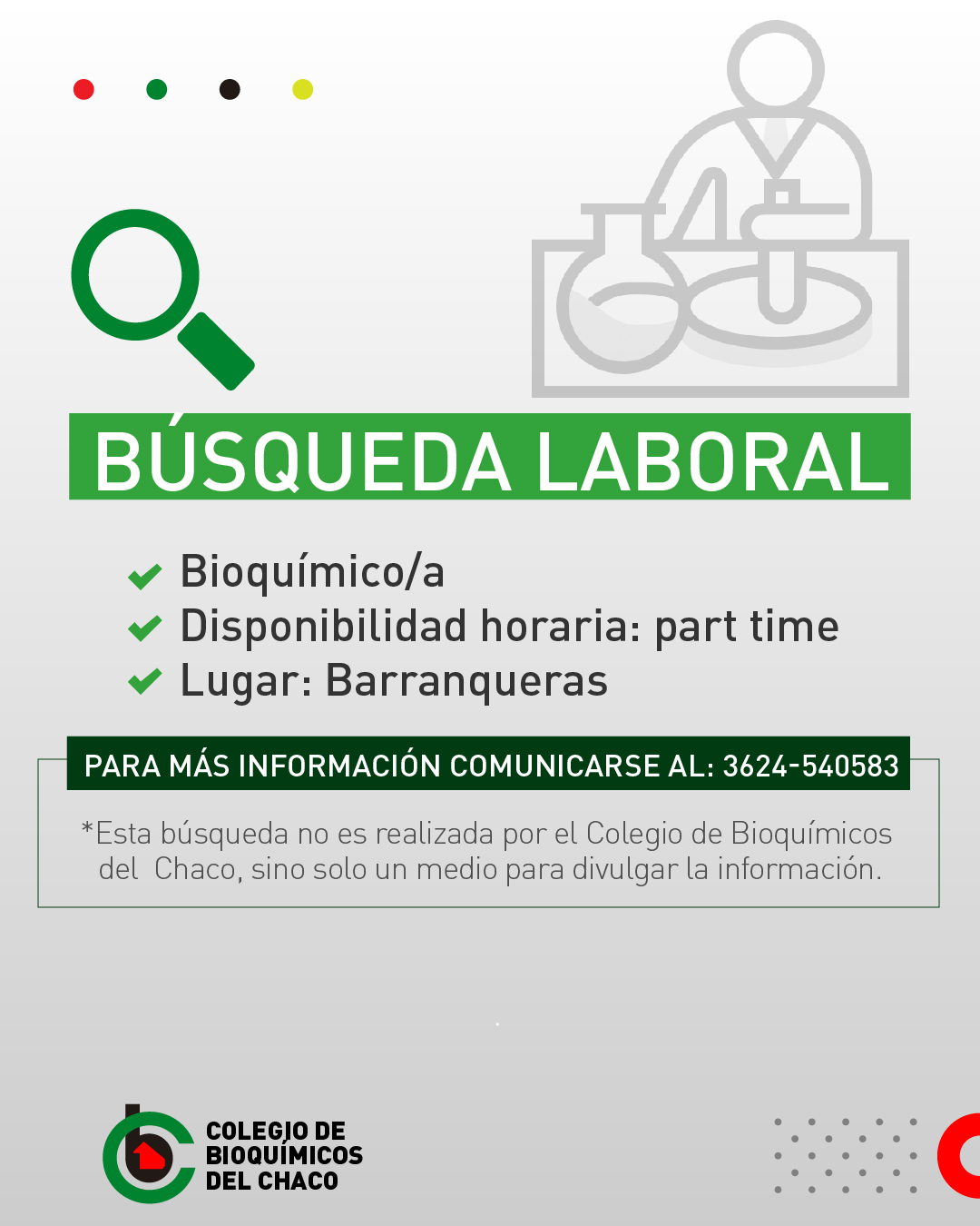 Les informamos a nuestros profesionales que se encuentra abierta una nueva búsqueda laboral para bioquímicos/as en la ciudad de Barranqueras, Chaco. Los profesionales deberán contar con disponibilidad part time (de 7 a 12hs de lunes a viernes). Buena remuneración y por sobre todo proyecto a futuro.