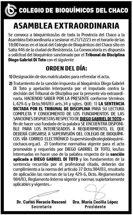 Se convoca a bioquímicos/as de toda la Provincia del Chaco a la Asamblea Extraordinaria a sesionar el 21/12/23 en el horario de las 18:00 horas en el local del Colegio de Bioquímicos del Chaco sito en Salta 446 de la ciudad de Resistencia. La Convocatoria es dispuesta a solicitud del bioquímico sancionado por el Tribunal de Disciplina Diego Gabriel Di Toto con el siguiente