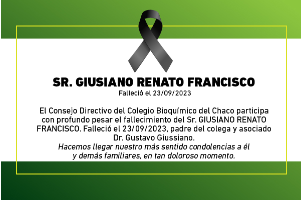 El Consejo Directivo del Colegio Bioquímico del Chaco participa con profundo pesar el fallecimiento del Sr. GIUSIANO RENATO FRANCISCO. Fallecio el 23/09/2023, padre del colega y asociado Dr. Gustavo Giussiano.