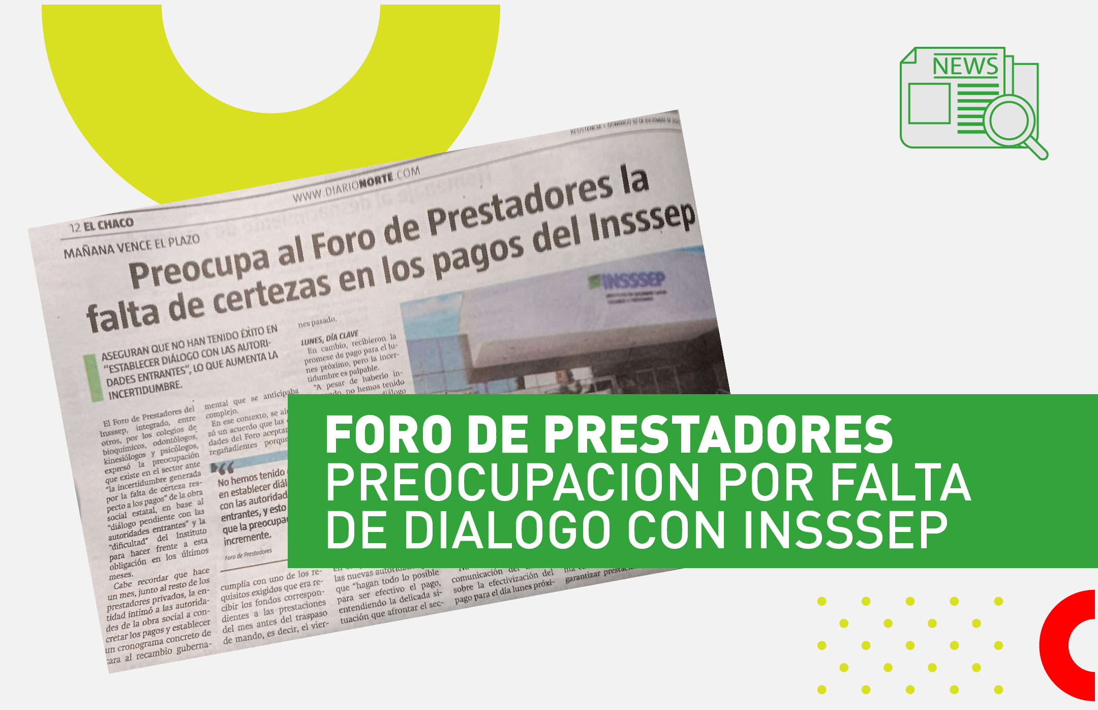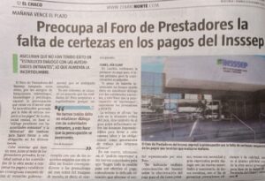 No habiendo recibido comunicación de Insssep sobre la efectivización del pago para el día lunes próximo, vemos con necesidad y gran expectativa poder dialogar con las nuevas autoridades y mantenerla de forma continua, con el fin de garantizar prestaciones eficientes y de calidad, tanto en el ámbito público como de la obra social provincial, para bien de la Salud de la Provincia del Chaco.