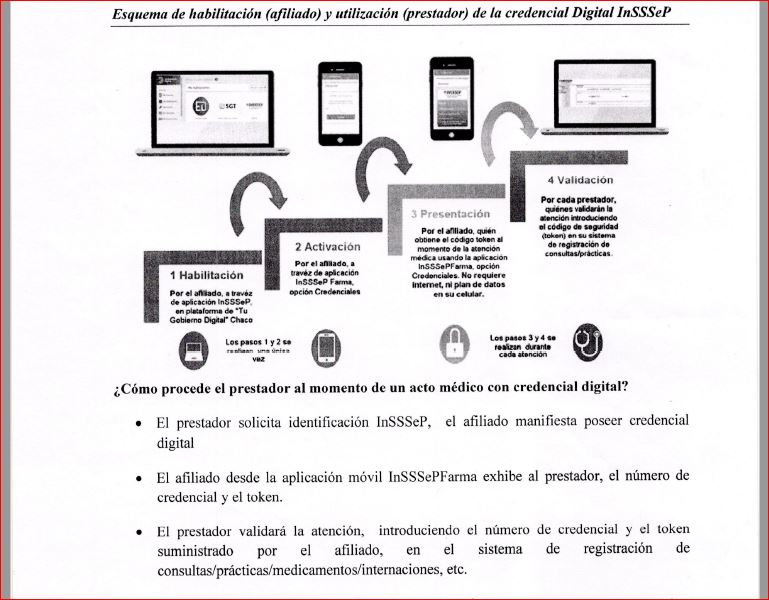 «Credencial Digital» le permite al afiliado obtener un código token al momento de la atención médica usando la aplicación InSSSePFarma, que luego será validada por cada prestador, introduciendo el Token en el sistema de registración de consultas/prácticas. Esta acción no requiere de conexión a internet, ni plan de datos del celular.