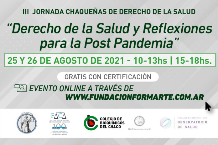 El 25 y 26 de agosto se realizará la III Jornada Chaqueñas de Derecho de la Salud bajo el lema “Derecho de la Salud y Reflexiones Para la Post Pandemia”. El encuentro será virtual y gratuito a través de la web de Fundación Formarte.