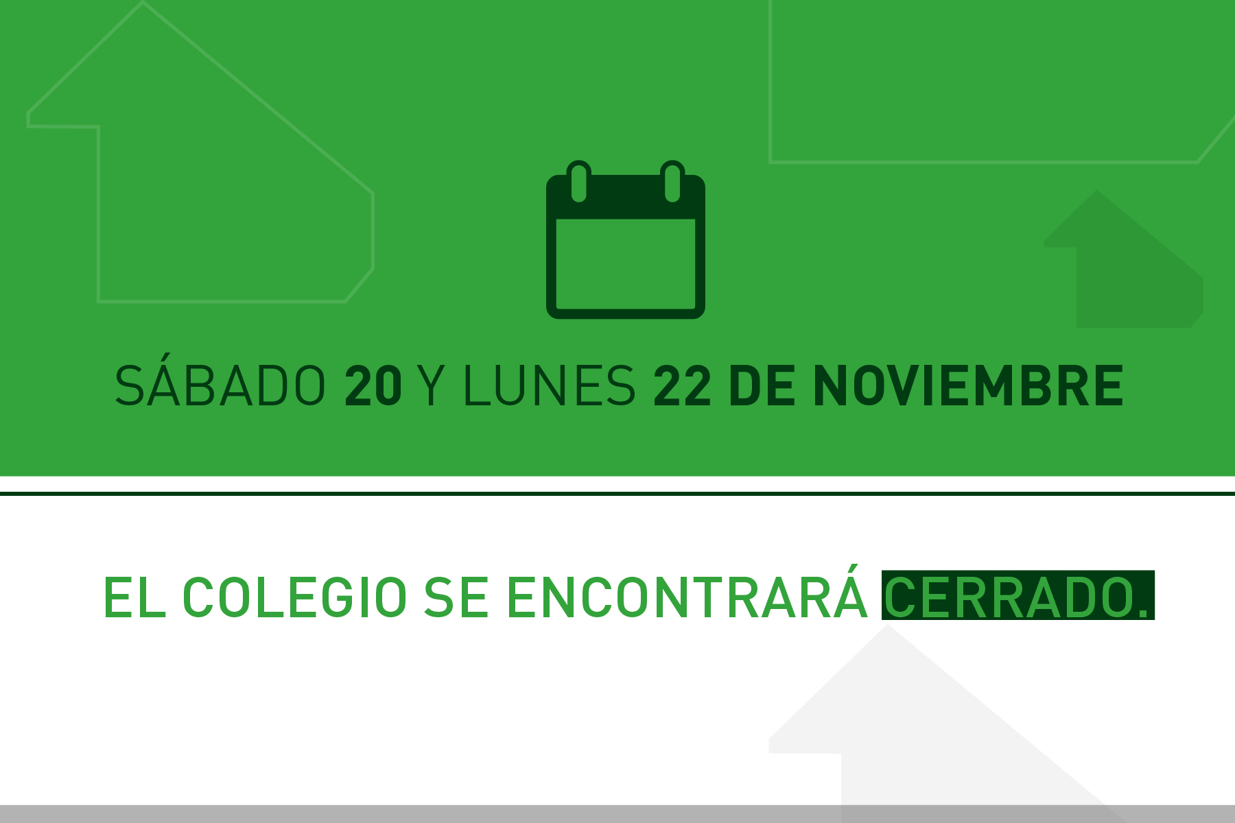 NOTICIAS Información importante sobre la atención administrativa Por Agustina Mots - 17/11/2021 2 15590 FacebookXPinterestWhatsApp El Colegio se encontrará cerrado el sábado 20 y el lunes 22 de noviembre debido al Feriado Nacional por el Día de la Soberanía Nacional.
