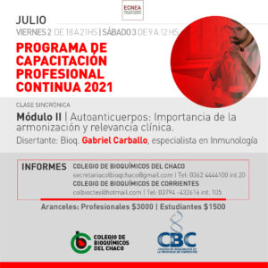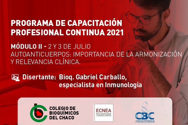 Se encuentra abierta la inscripción para participar del Módulo 2 de nuestro Programa de Capacitación Profesional Continua 2021. El tema central en esta oportunidad será «Autoanticuerpos: Importancia de la armonización y relevancia clínica». El disertante será el Bioq. Gabriel Carballo, especialista en Inmunología, Jefe del Laboratorio de Inmunología del Hospital Carlos G. Durand. y Miembro Fundador del Grupo ICAP.