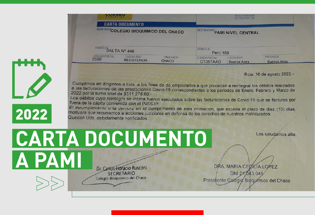 Informamos a nuestros matriculados que, en el día de ayer, se envió una Carta Documento a PAMI, en referencia a los débitos aplicados sobre las prestaciones Covid-19, de los últimos períodos.