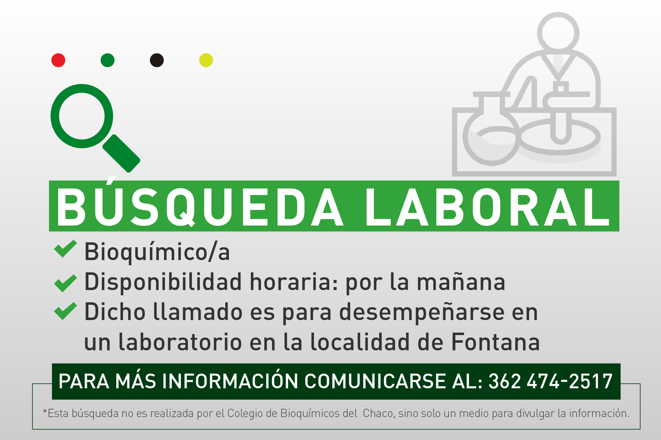 Les informamos a nuestros profesionales que se encuentra abierta una nueva búsqueda laboral para bioquímicos/as en un laboratorio de la ciudad de Fontana, Chaco. Los profesionales deberán contar con disponibilidad por la mañana