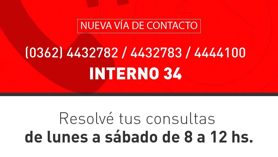 Los profesionales podrán resolver sus consultas de forma telefónica comunicándose a los números de atención institucionales (0362) 4432782 / 4432783 / 4444100 INTERNO 34, de lunes a sábados de 8 a 12 hs.
