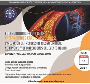 Invitamos a nuestros profesionales matriculados a participar del curso «El Laboratorio frente a las Enfermedades Cardiovasculares: Evaluación de Factores de Riesgo Lipídico, no Lipídico y de Marcadores de Evento Agudo», bajo la dirección del Dr. Fernando Brítez y organizado por la Asociación Bioquímica Argentina.