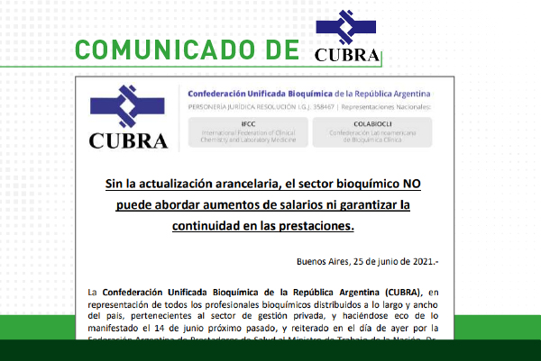 La Confederación Unificada Bioquímica de la República Argentina (CUBRA), en representación de todos los profesionales bioquímicos distribuidos a lo largo y ancho del país, pertenecientes al sector de gestión privada, y haciéndose eco de lo manifestado el 14 de junio próximo pasado, y reiterado en el día de ayer por la Federación Argentina de Prestadores de Salud al Ministro de Trabajo de la Nación, Dr. Claudio Moroni, y a las autoridades de la Federación de Asociaciones de Trabajadores de la Sanidad Argentina (FATSA), informa a la sociedad toda, que si se continúa con el atraso en la debida actualización de los aranceles por parte de los financiadores (Obras Sociales, Empresas de Medicina Prepaga, PAMI), este sector no podrá afrontar los aumentos de salarios que se desprendan de la paritaria correspondiente al 2021.