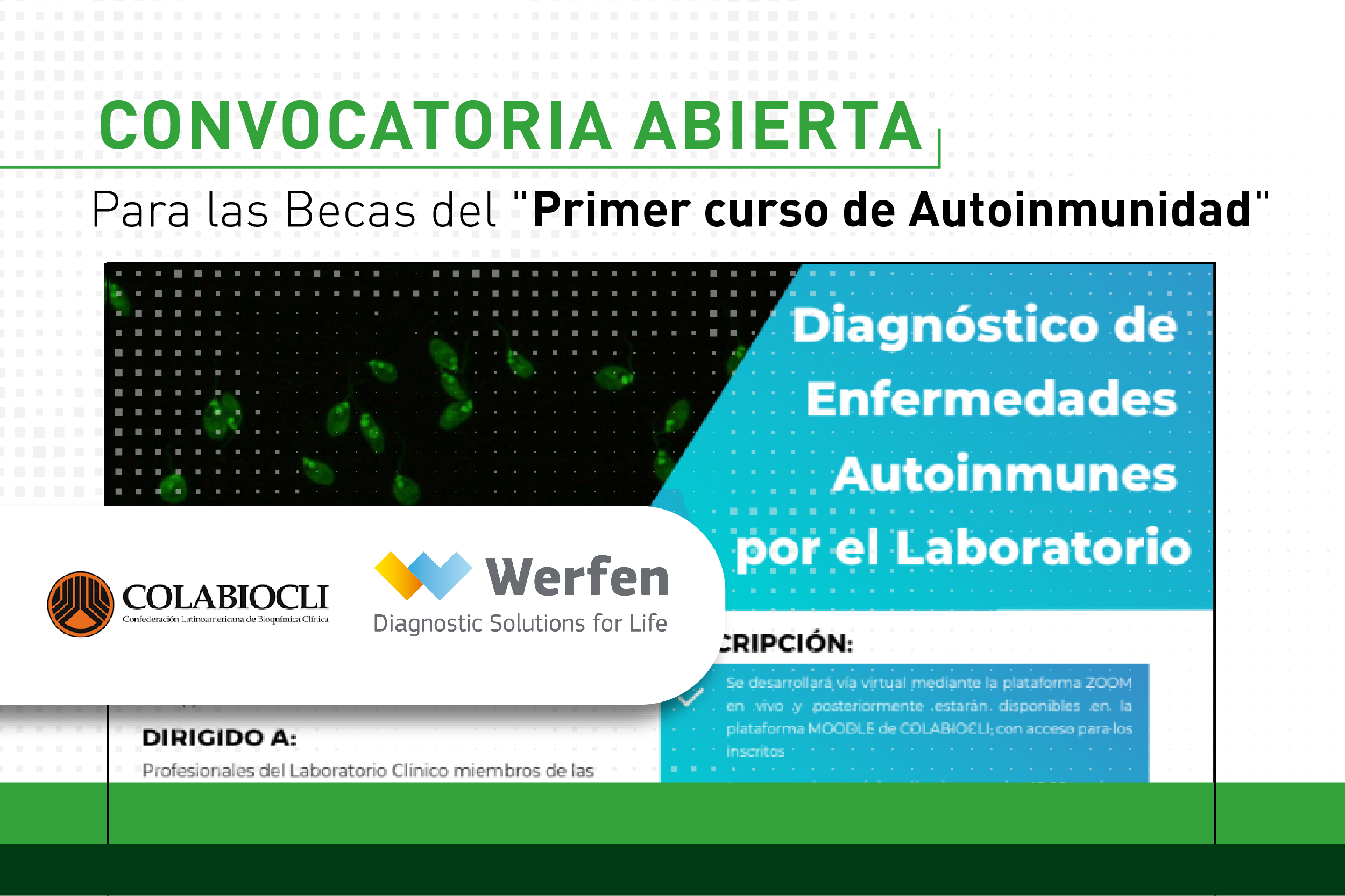 La modalidad del mismo será virtual, a través de la plataforma Zoom. Inicia el 05 de julio y tendrá una duración de tres meses. El objetivo del curso es ampliar los conocimientos en el diagnóstico de enfermedades autoinmunes a los profesionales de laboratorio clínico en Latinoamérica.