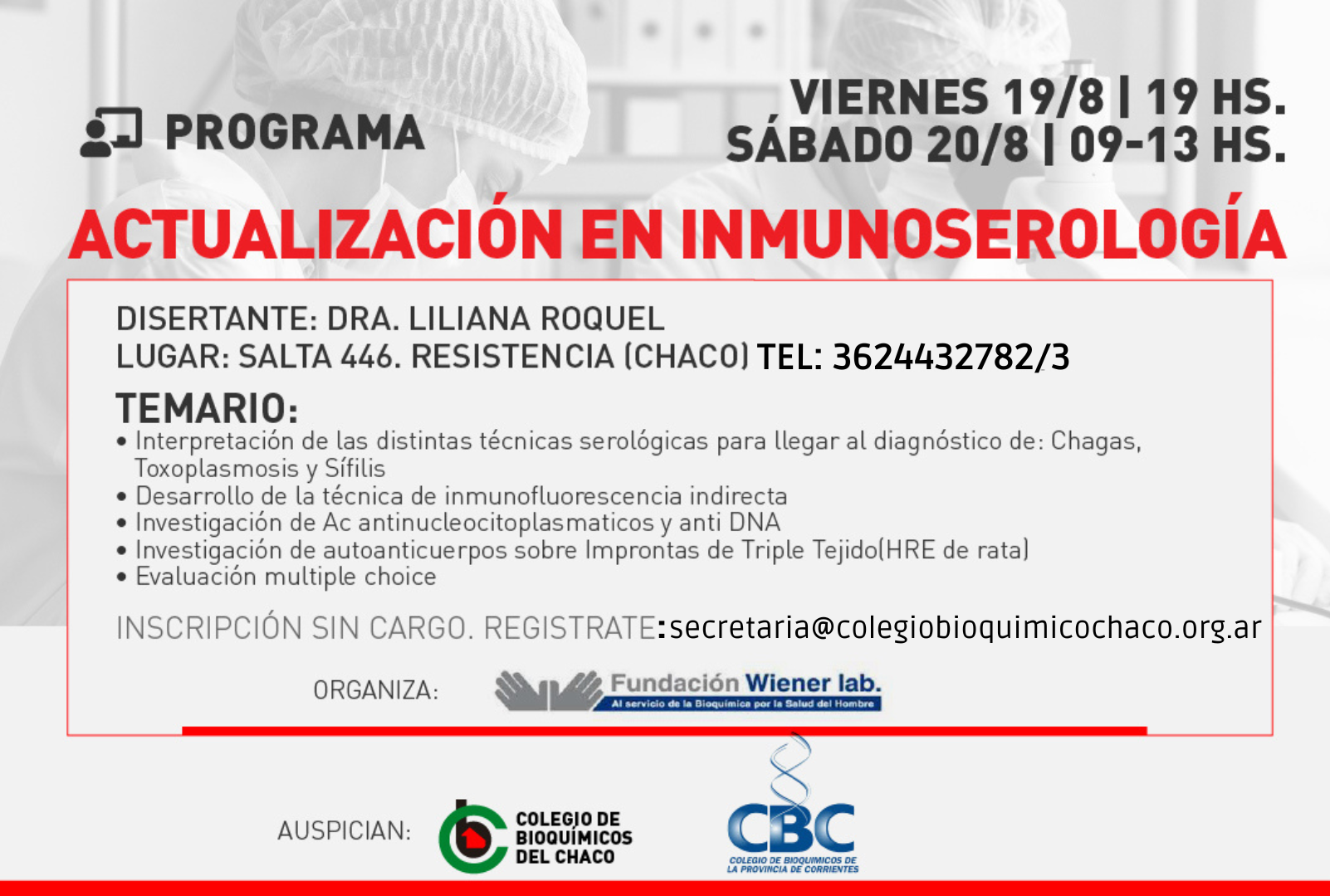 El próximo viernes 19, comienza el programa de «Actualización en Inmunoserología» a cargo de la Dra. Liliana Roquel, jefa de Inmunoreumatología de la Unidad Asistencial Dr. César Milstein (ex Hospital Francés) de Bs.As, Directora Técnica del Laboratorio IFI, Buenos Aires y Coordinadora del Area de Inmunología de la Asociación Bioquímica Argentina.