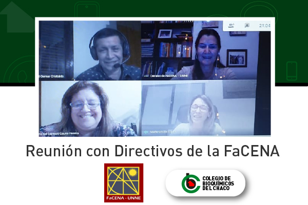 El jueves 15 de abril el Colegio se reunió con las Autoridades Directivas de la Facultad de Ciencias Exactas, Naturales y Agrimensura de la UNNE. En el encuentro virtual estuvieron presentes María Viviana Godoy Guglielmone, Decana de la FaCENA, la Dra. María del Carmen Gauna, Subsecretaria de Asuntos Académicos y la Pta. del Colegio de Bioquímicos, María Cecilia López.