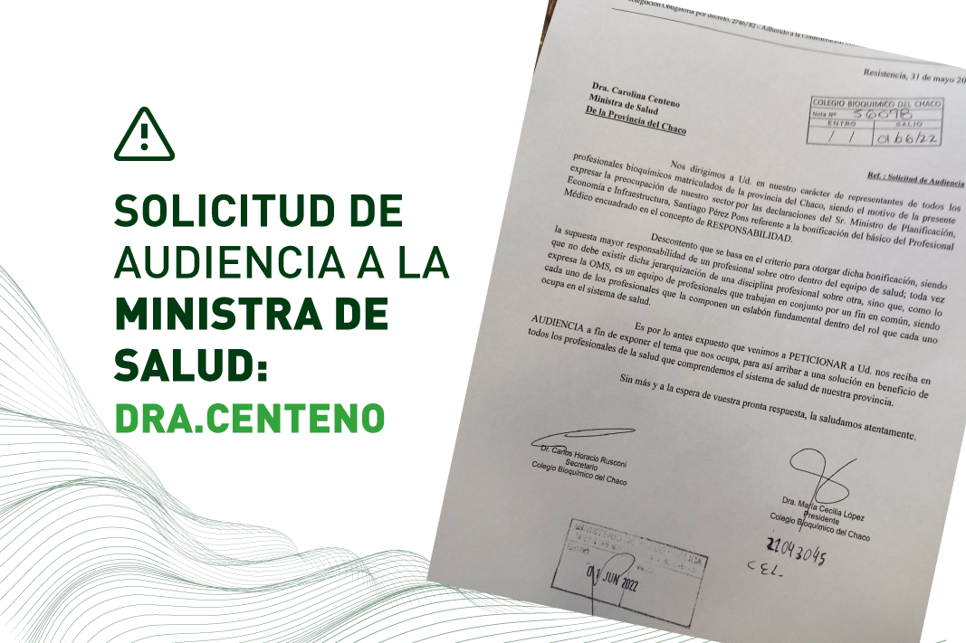 En el día de la fecha, desde el Colegio de Bioquímicos del Chaco, se le solicitó una audiencia con la Ministra de Salud de la Provincia, la Dra. Carolina Centeno, en representación de toda la comunidad bioquímica; con motivo de preocupación por las noticias trascendidas sobre la bonificación del básico Profesional Médico.