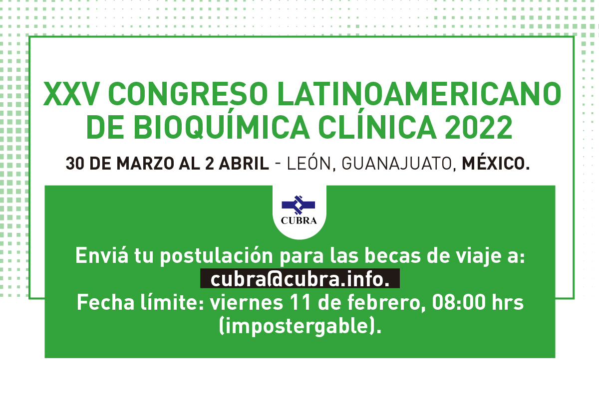 Estimados colegas, nos complace informar que se encuentra abierta la inscripción para acceder a Becas de Viaje destinadas a aquellos jóvenes científicos de países seleccionados, para participar del XXV Congreso Latinoamericano de Bioquímica Clínica, organizado por COLABIOCLI. El mismo, se llevará a cabo a partir del día 30 de marzo, hasta el día 02 de abril del corriente, en la Ciudad de León, Guanajuato, México.